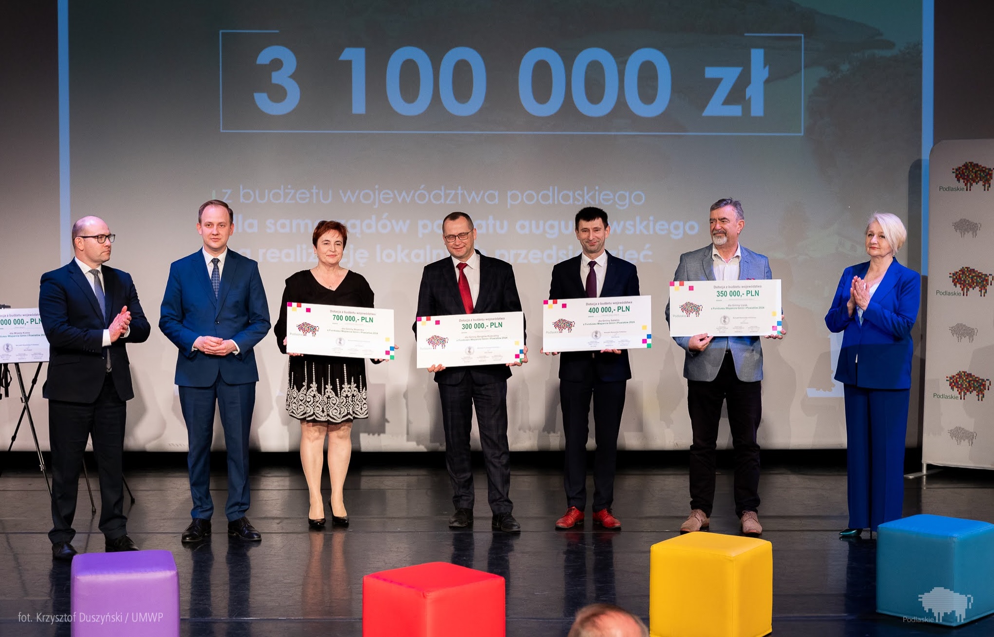 W czwartej edycji autorskiego programu Samorządu Województwa Podlaskiego wsparcie otrzymało 119 gmin na łączną kwotę 61 mln zł. We wtorek, 2 kwietnia, marszałek Artur Kosicki, wicemarszałek Marek Olbryś oraz członek zarządu województwa Wiesława Burnos wręczyli symboliczne czeki z dotacjami beneficjentom Funduszu Wsparcia Gmin i Powiatów.